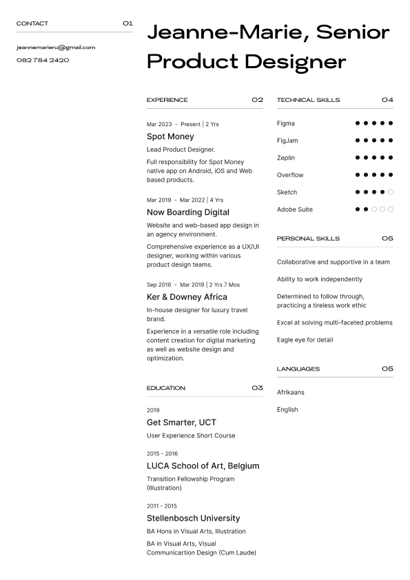 Jeanne-Marié is an exceptional creative with a deep understanding of the relationship between Design and Product. I thoroughly enjoyed working with her not only for her vast experience in UX/UI and design methodologies, but also for her calm, friendly and professional demeanour.