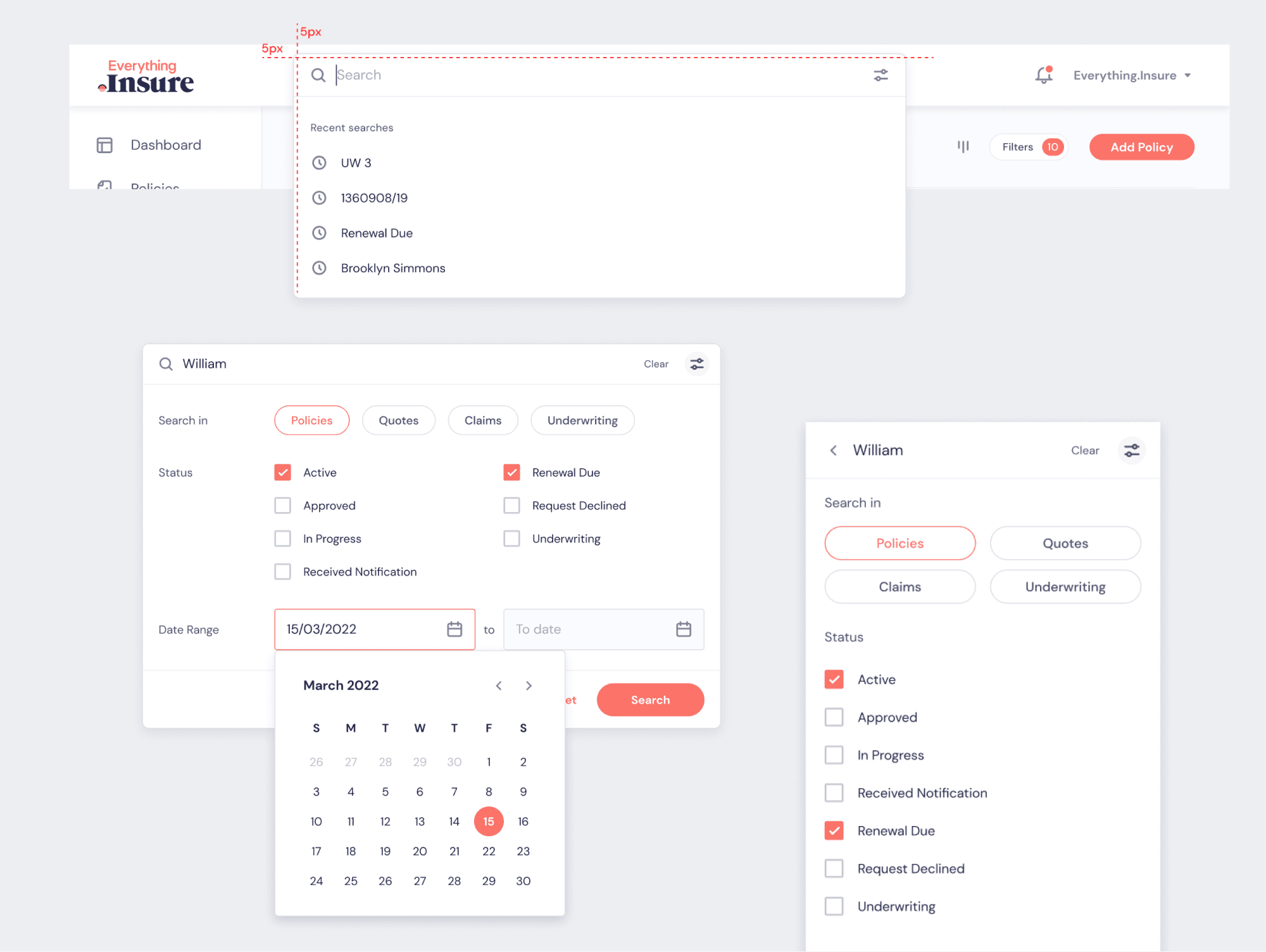 I designed a cross-functional search system that enables brokers to quickly locate policies, clients, or claims—regardless of which section of the platform they’re in. This unified search experience cuts across tabs and data silos, dramatically improving discoverability and reducing time spent navigating through complex datasets.